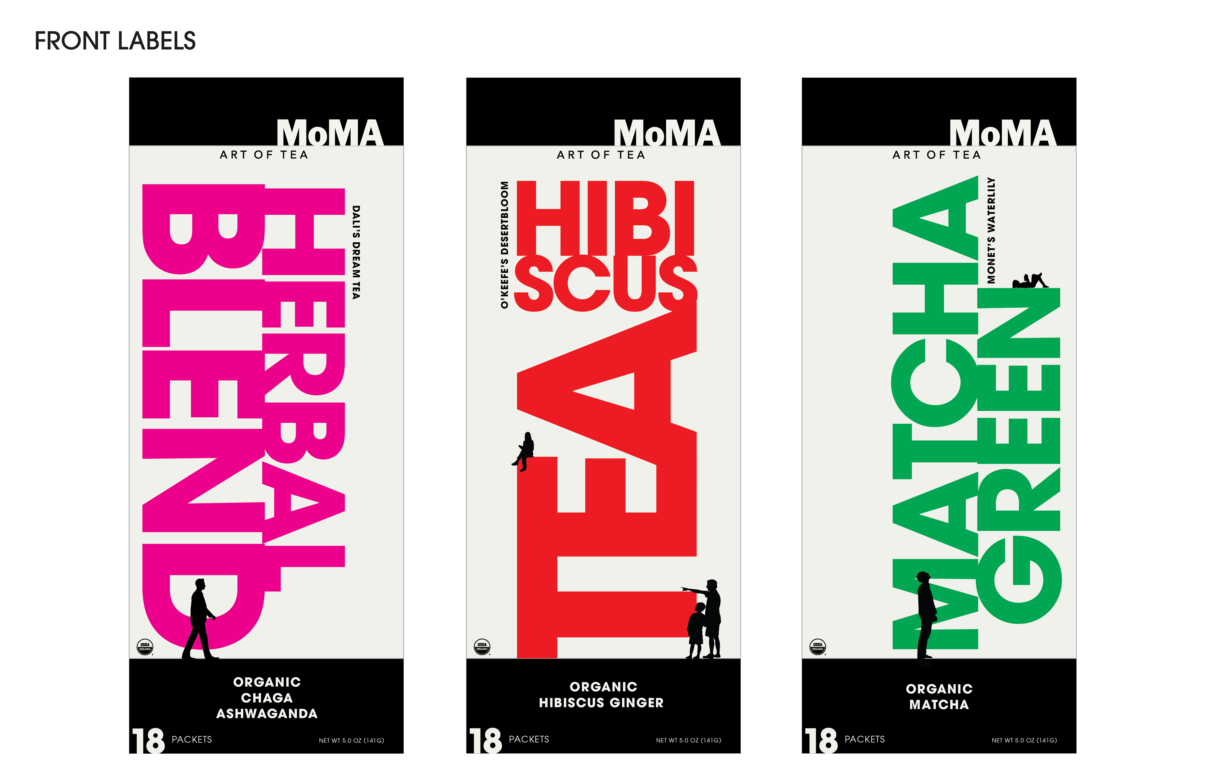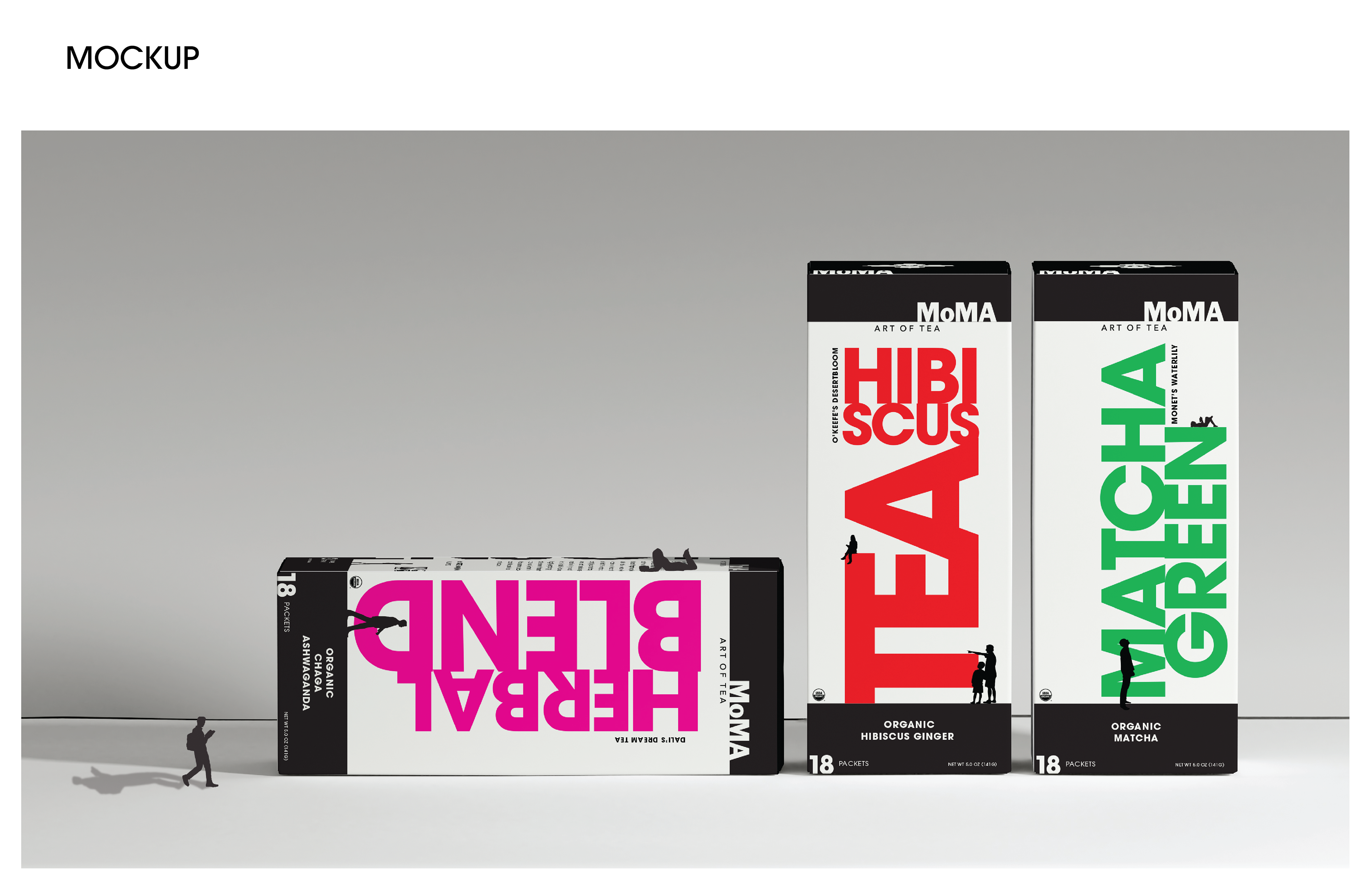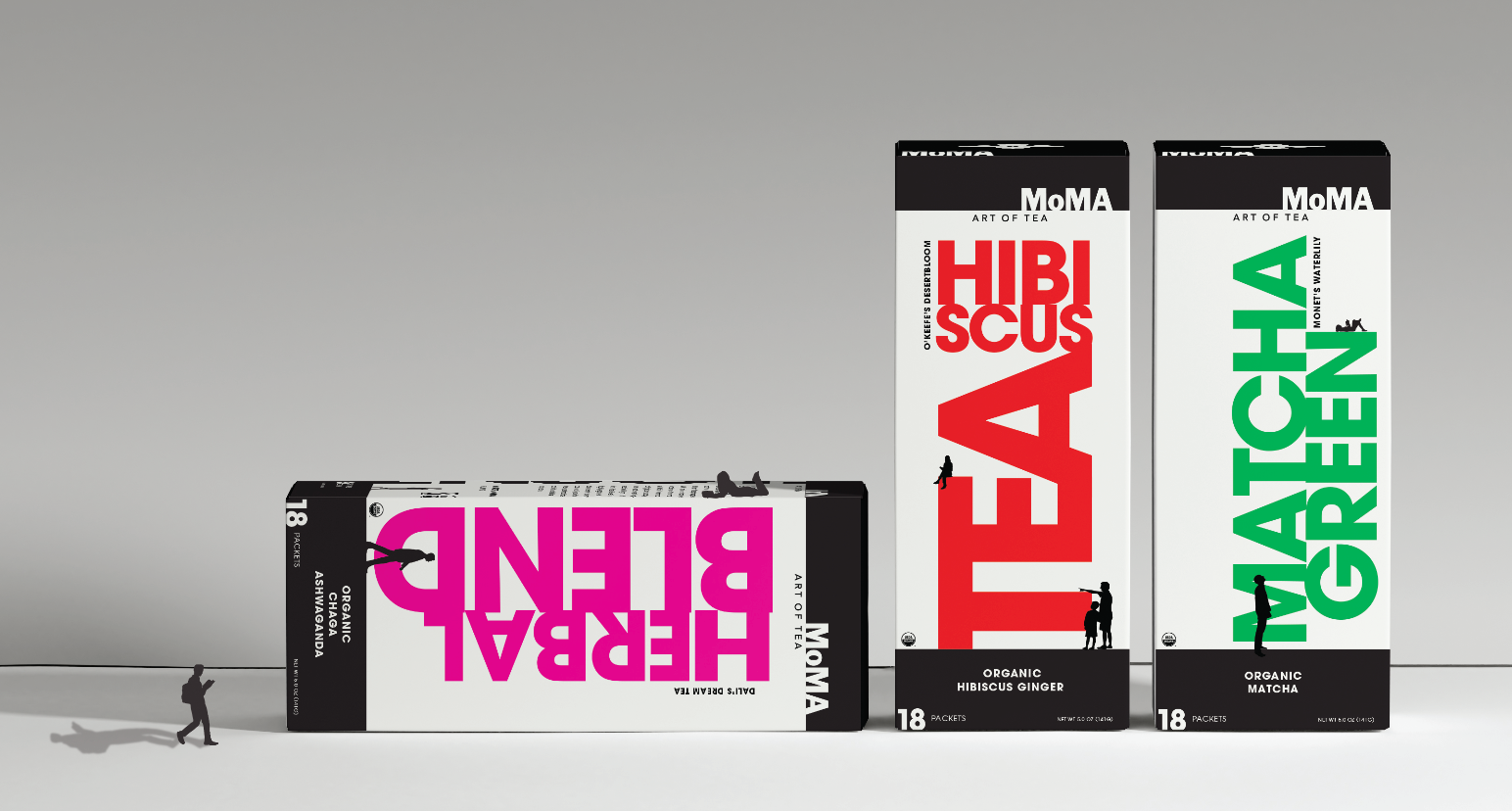 Small human figures are placed throughout the layout, observing and interacting with the type as if it were on display in a gallery. This creates a playful tension between scale and meaning—the packaging becomes both product and artwork, something to look at as much as to use. The concept ties back to MoMA’s mission of bringing art into everyday life, where even a simple tea box can invite curiosity and play.