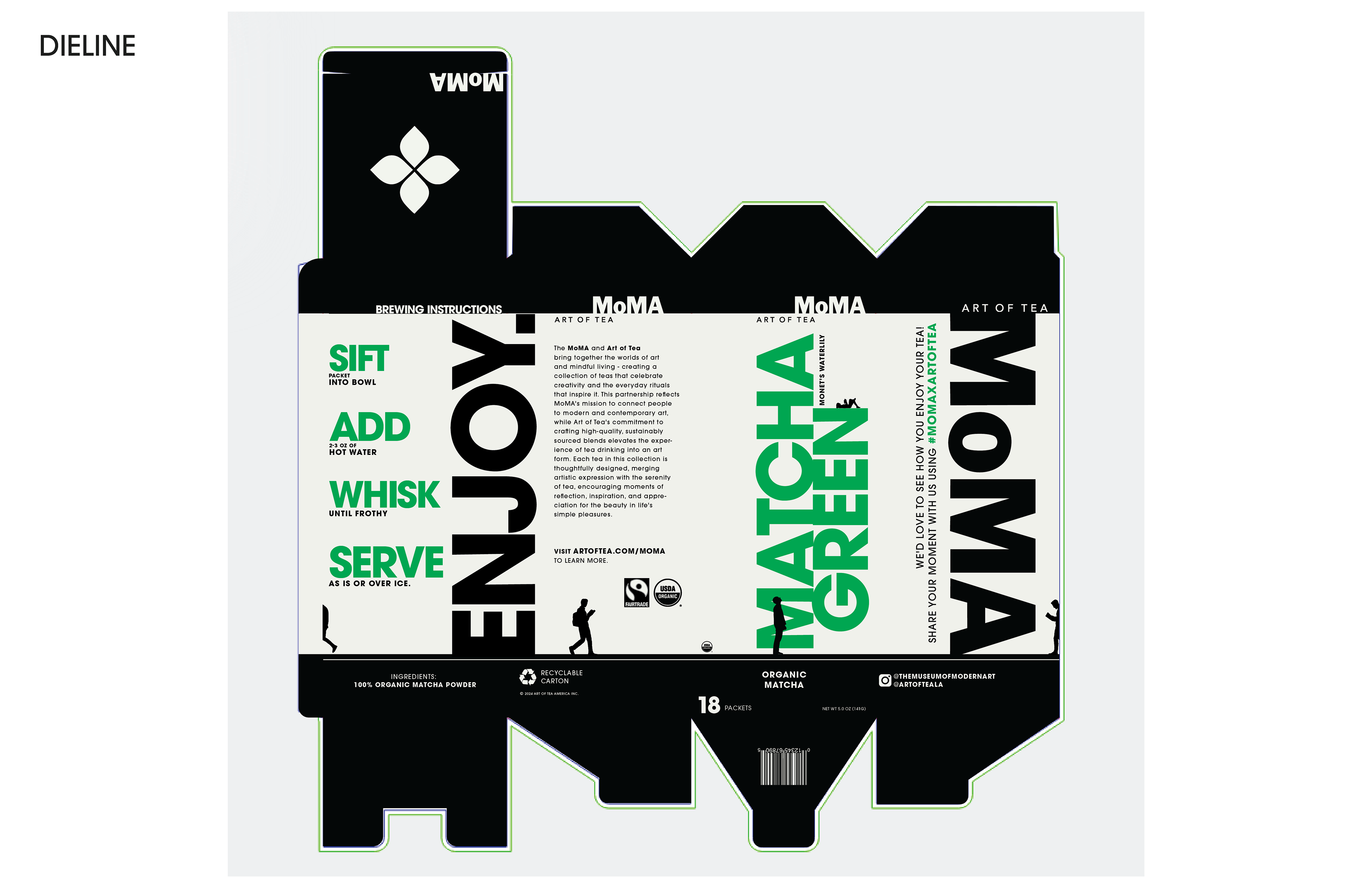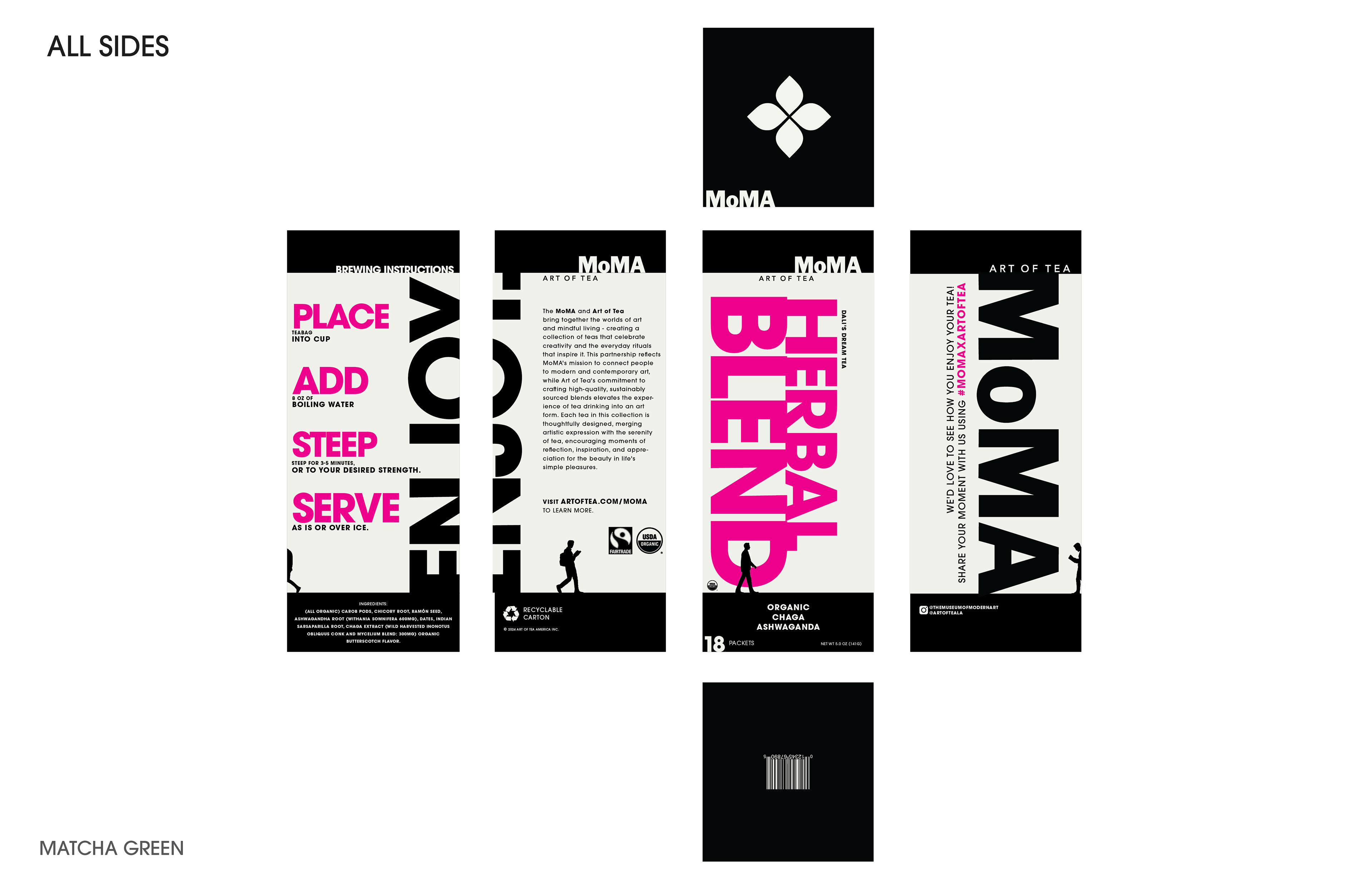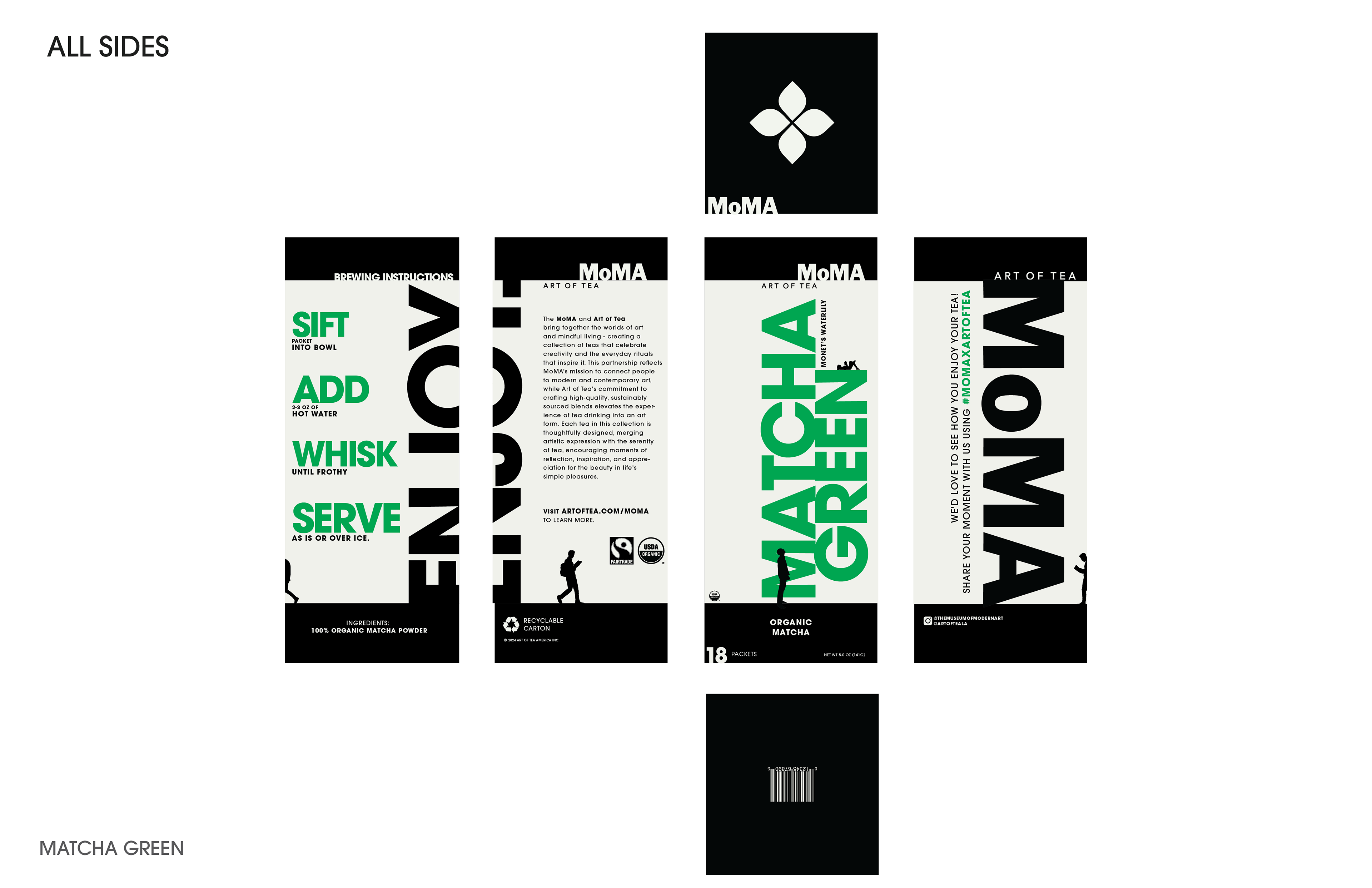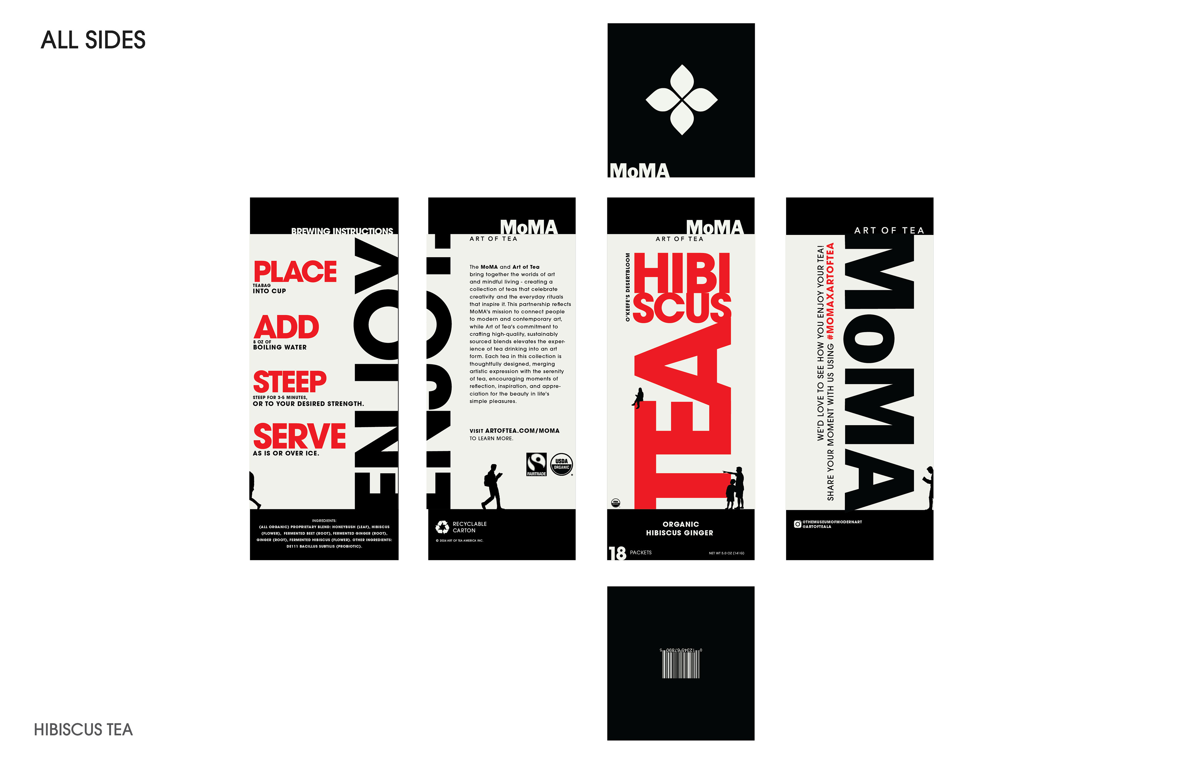 Small human figures are placed throughout the layout, observing and interacting with the type as if it were on display in a gallery. This creates a playful tension between scale and meaning—the packaging becomes both product and artwork, something to look at as much as to use. The concept ties back to MoMA’s mission of bringing art into everyday life, where even a simple tea box can invite curiosity and play.