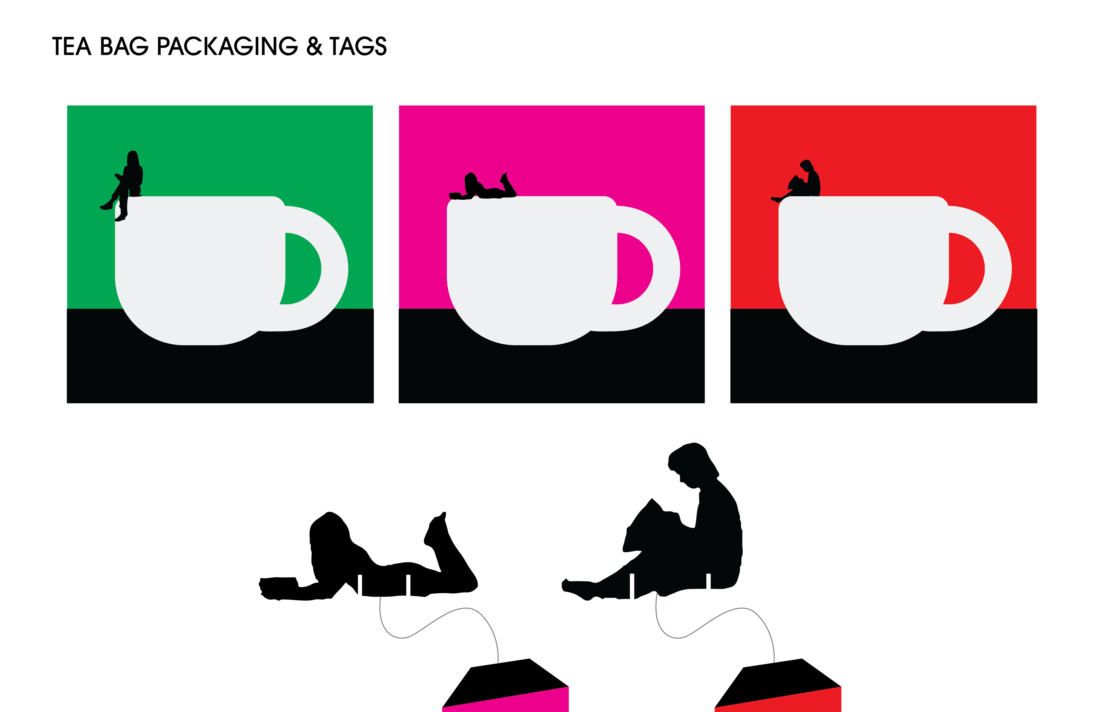 The teabags and tags expand on the idea by turning the tea bags into little scenes of rest and reflection. Each tea tag can connect to a large cup above it: where small figures sit, lounge, or read on the edge of a real cup. It’s a playful way of showing how something as simple as making tea can feel like taking a moment for yourself—quiet, thoughtful, and a bit like experiencing art in everyday life.